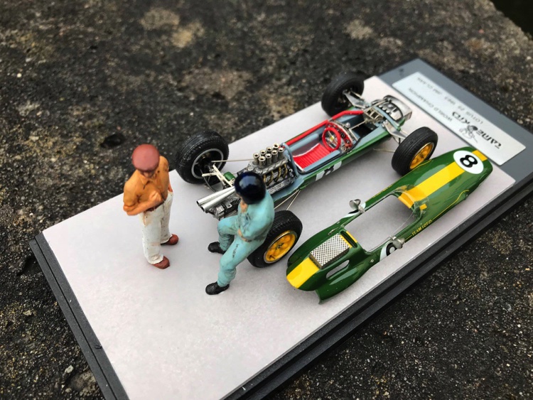 * La Lotus 25 en petite tenue et avec Colin Chapman, "l'homme à la casquette"