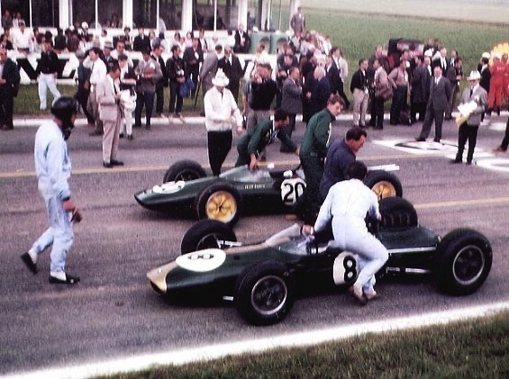 Grille de départ du GP de Grande Bretagne à Aintree aux côtés de John Surtees sur sa Lola Mk4 A et Innes Ireland sur la Lotus 24 du UDT Laystall Racing Team