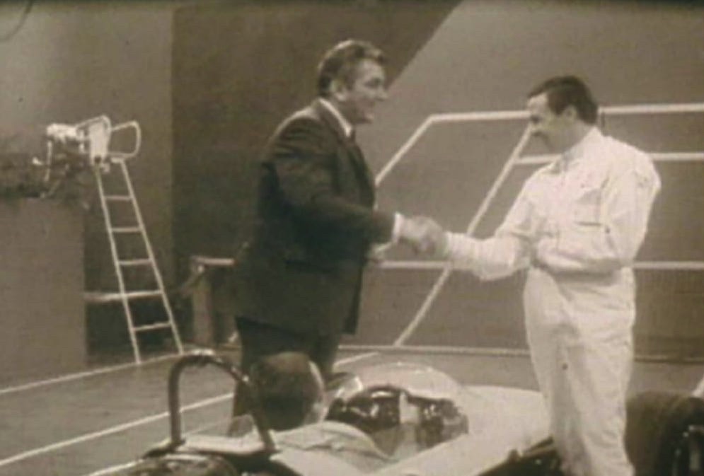 Je vois que vous êtes venu avec votre mécanicien » : Jim Clark et Kurt Ahrens font leur entrée dans l’émission « Aktuellen Sportstudio » dans la soirée du 6 avril 1968 (sources : YouTube -WDR Jim Clark portrait- et ZDF.de).