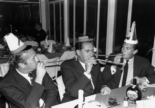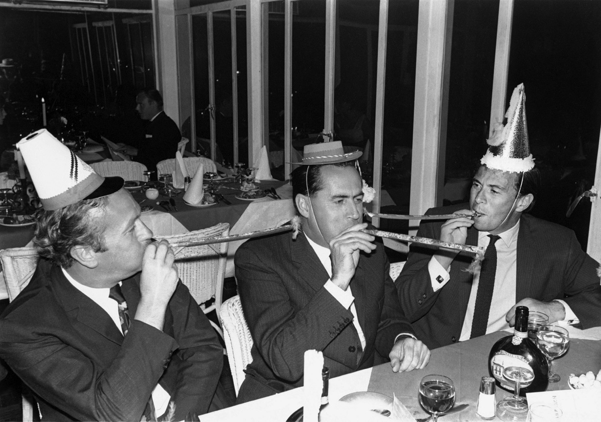 la "Party-Hill annuelle réunissait des champions britanniques : Jim, Graham Hill (l'organisateur avec sa femme Bette) et Stirting Moss. Sur les genoux de Graham ; Brigitte, la soeur de Damon...