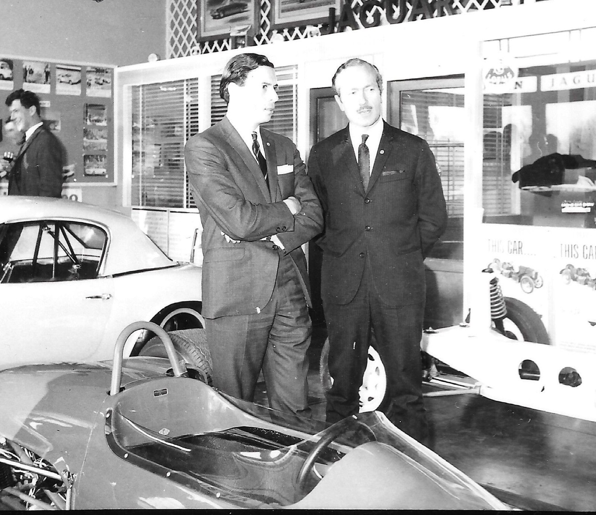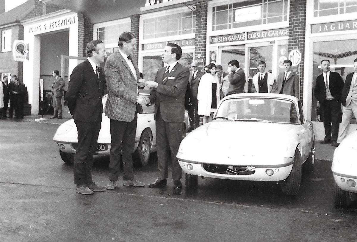 Colin, et JIm à la consession Lotus de avec Rob Walker pour la présentation de la Lotus Elan