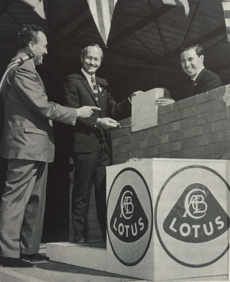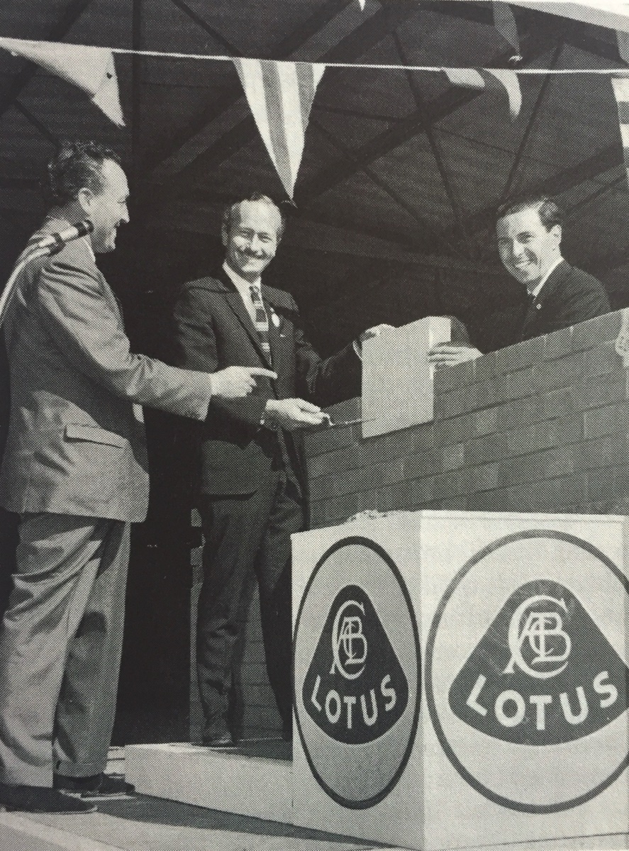 Jimmy pose la première brique de la future usine Lotus à Hétel en compagnie de Colin Chapman