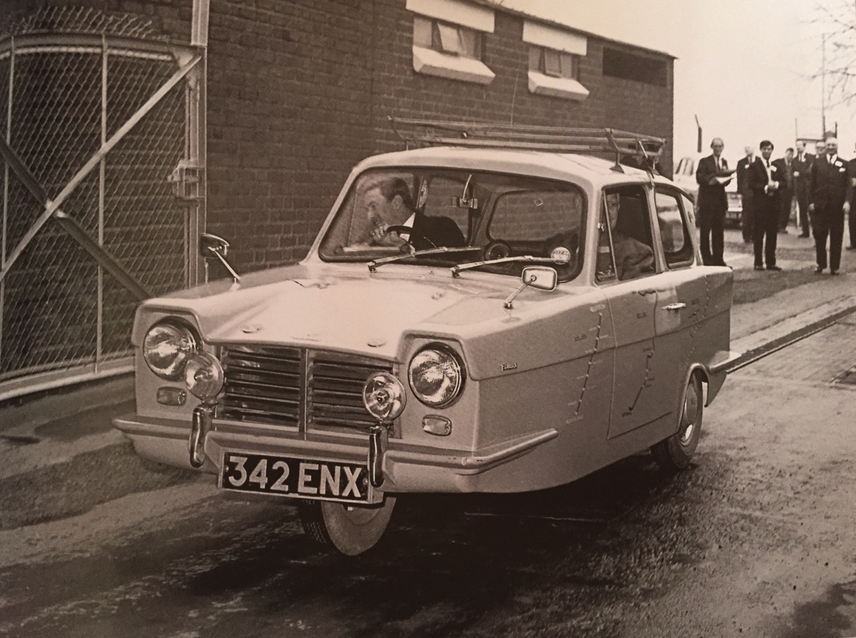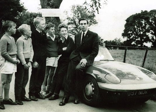 JIm au volant d'une voiture anglaise, à 3 roues Reliant...