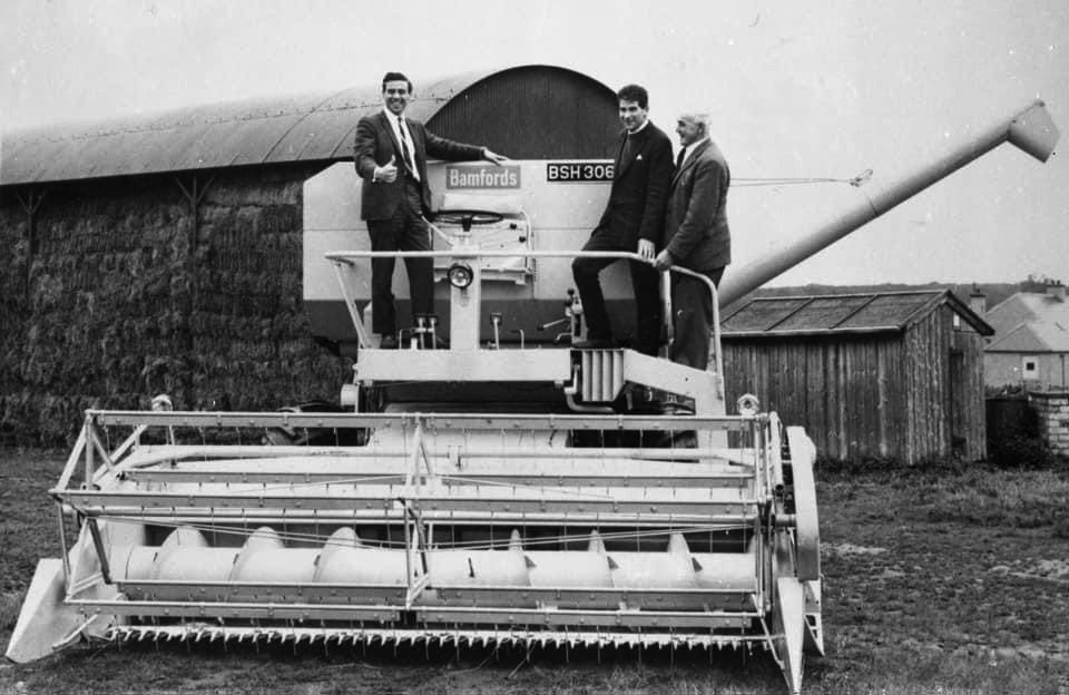 Jim trône fiérement sur la moissonneuse batteuse Bamfords que des représentants de la marque sont venus lui faire essayer entre 2 Gp en 1965...