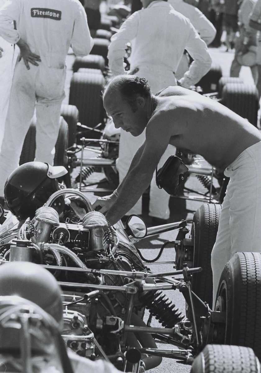 Jim n'hésitais pas à mettre les mains dans le moteur, ici sur la Lotus 25 typique avec son échappement "Noeud de vipère"