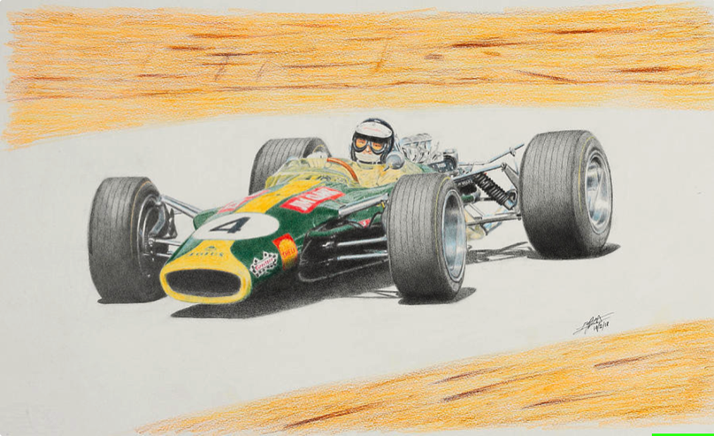 Après un certain temps, Il a commencé à dessiner des voitures, surtout des voitures de Formule 1, car il est devenu un fan de course après deux victoires particulières du célèbre Jim Clark sur Lotus à Indianapolis et la première victoire du moteur Cosworth (première course !) au GP des Pays-Bas à Zandvoort.