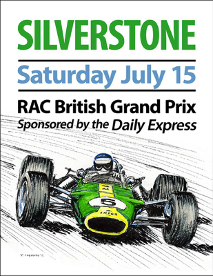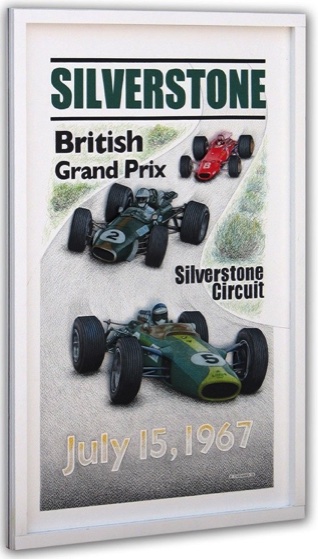 ✴ La «fausse» affiche du GP de Grande Bretagne 1967 à Silverstone avec Jim Clark devant Denis Hulme et Chris Amon : les