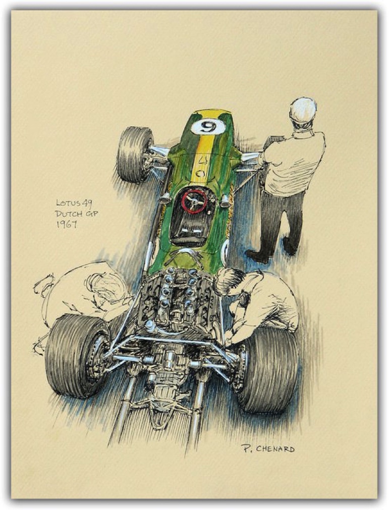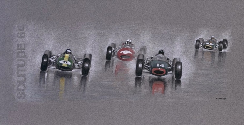 Paul Chenard est un vrai passionné d’automobile et de sport automobile : il collectionne les miniatures, les objets et réalise des toiles ou des dessins dont celui du GP de la Solitude.