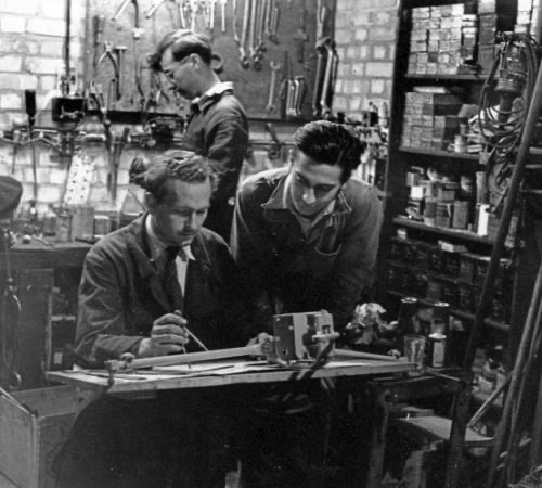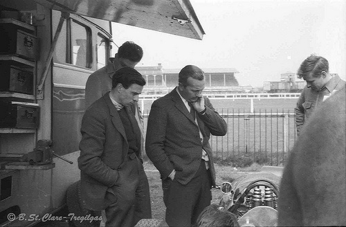 Colin Chapman et ses pilotes en 1960 : Innes Ireland, la recrue Jim Clark pour pallier aux absences de John Surtees qui courrait toujours ) moto...
