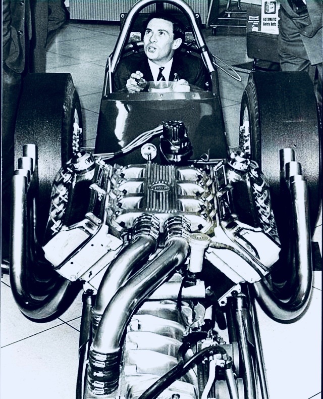 Jim pose dans le cockpit de la midget de Boby Marshman à Springfield sous l'oeil amusé de Dan Gurney