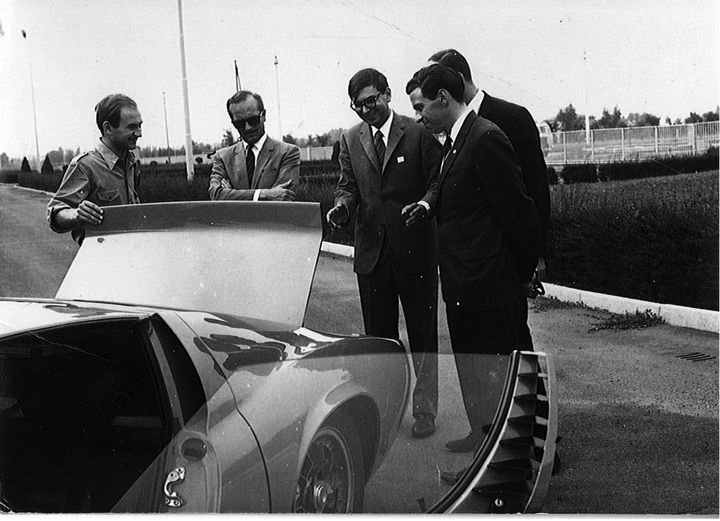 Présentation de la Lamborghini Miura en 1967 à Jim Clartk et Colin Chapman avec les ingénieux Stanzani et Dallara et du patron Feruccio Lamborghini