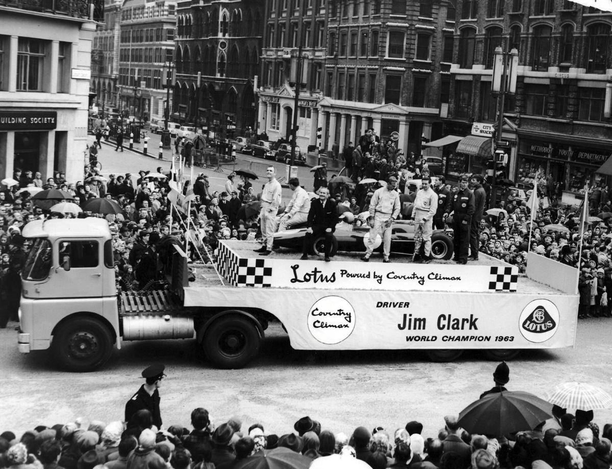 Parade dans les rues de Londres pour le Lord Mayor 's Show avec Colin Chapman, Mike Spence et les mécaniciens...
