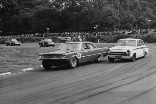 Snetterton 1964 : Jim à la poursuite de Brian Muir sur une Ford Galaxie et Mike Salmon suer une Ford Mustang