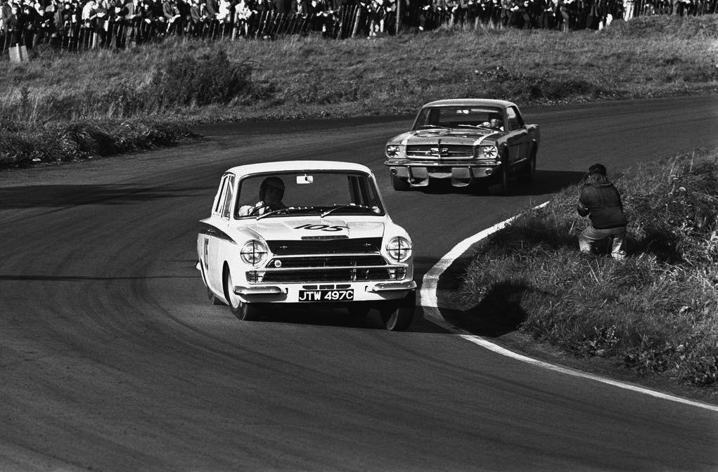 Jackie Oliver Mustang devant Brian Muir Ford Galaxie et Jim Clark Cortina en 1966