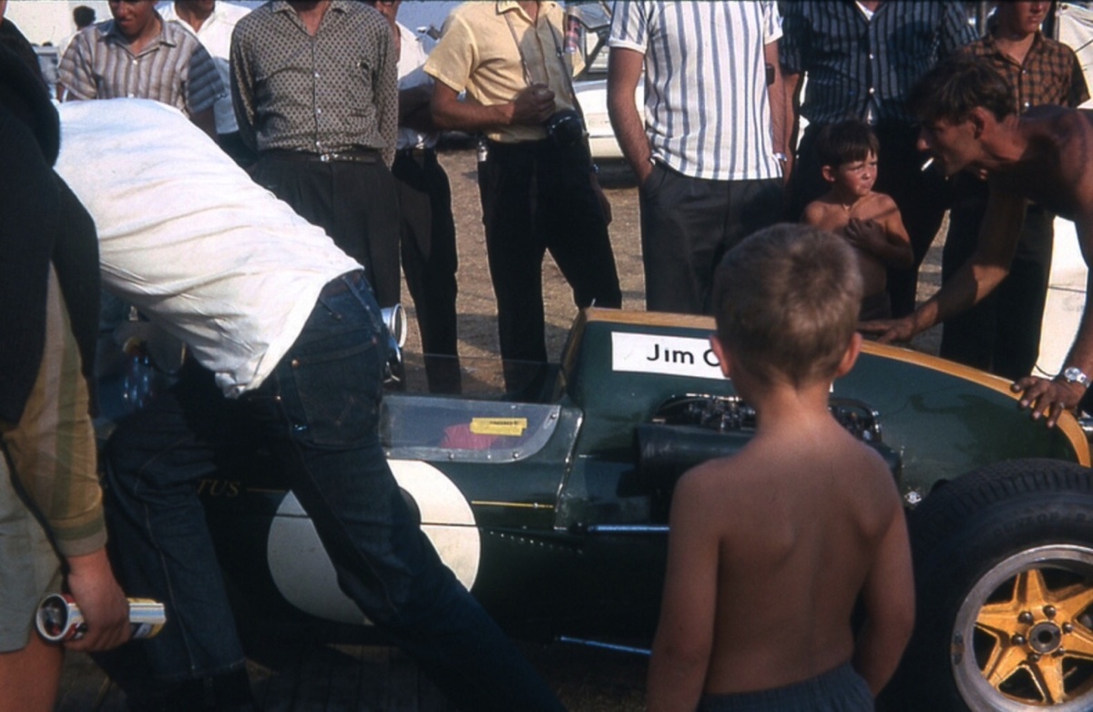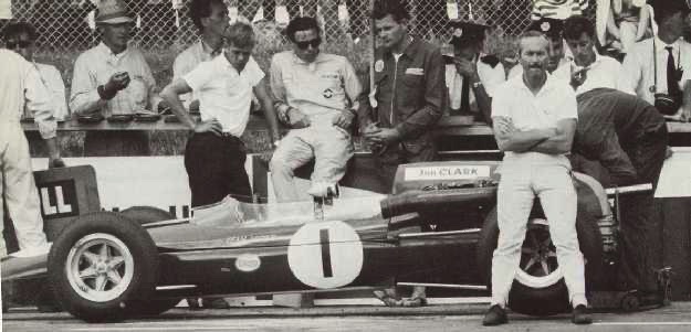 GP de Pukekohe : Jim, décontracté,parle avec les mécaniciens tandis que Colin Chapman est assis sur la roue arriere !