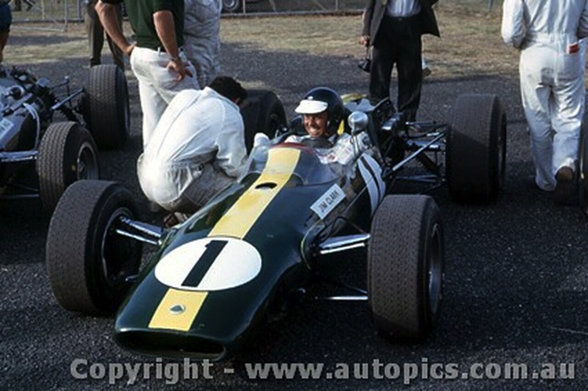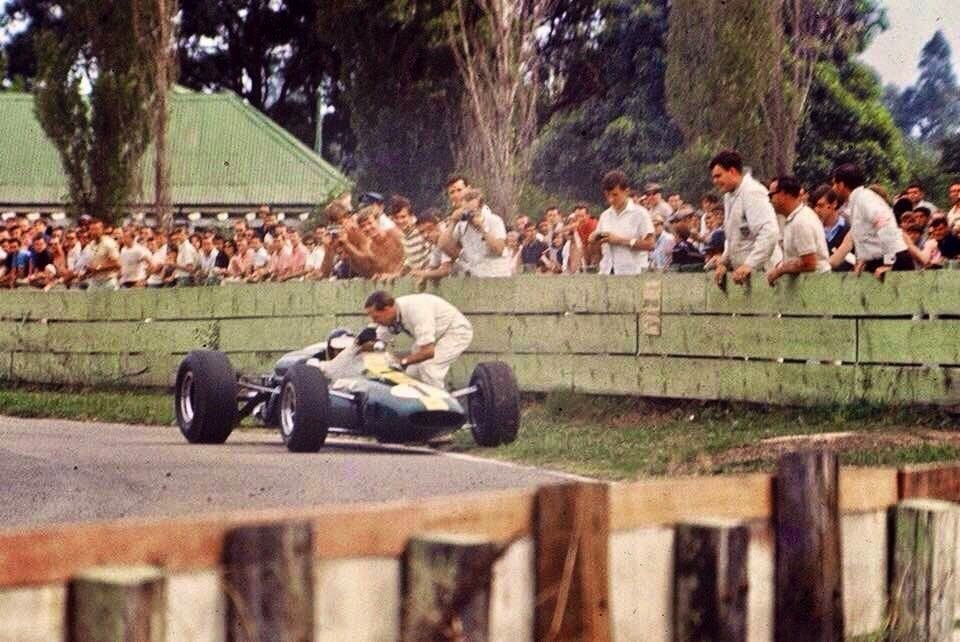 Prévue pour recevoit le moteur H16 BRM, la Lotus 33 sera finalement équipé du Climax 2,7 L pour courir en Tasmanie, ici, à Terratonga