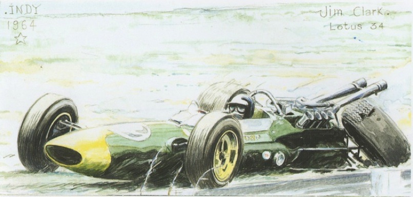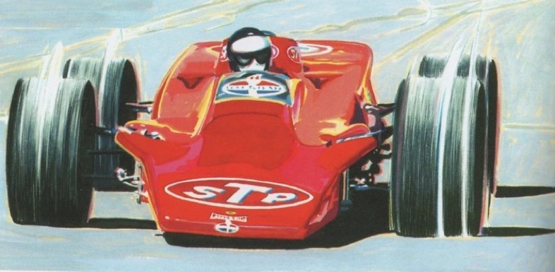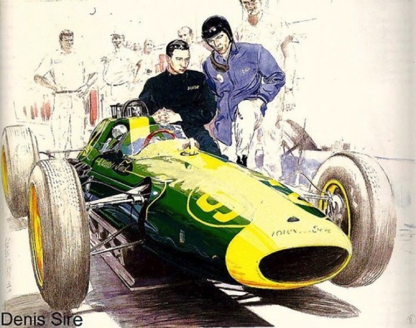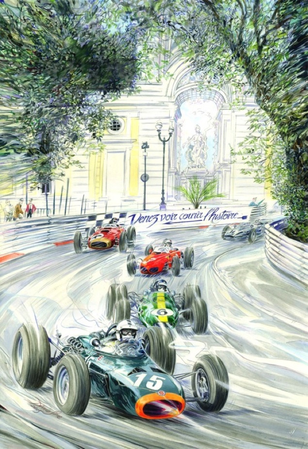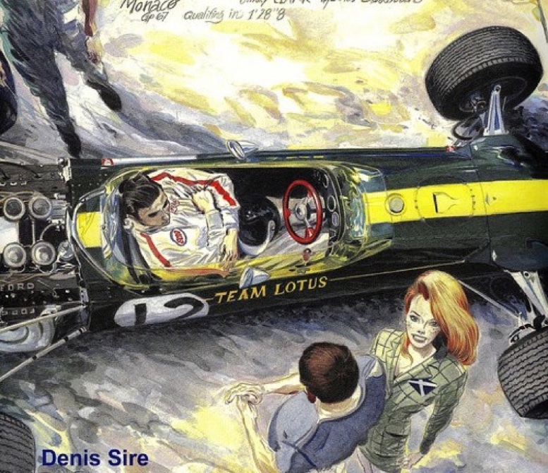 *Monaco 1967 et la Lotus 49 à moteur Ford V8 Cosworth (à noter, la jolie rousse écossaise, typique de l’oeuvre de Denis Sire..)
