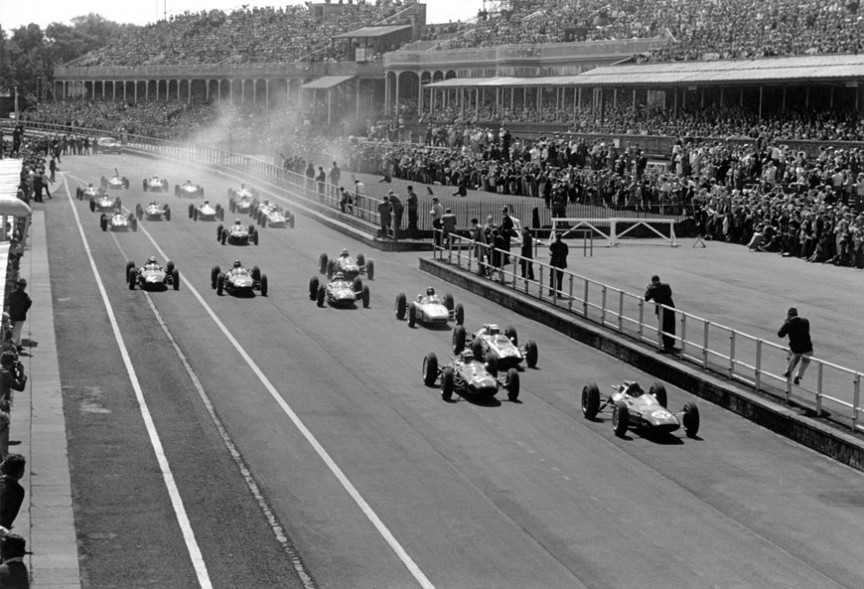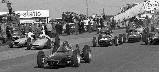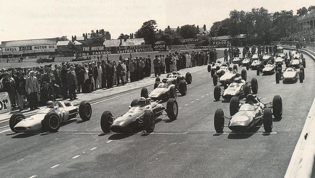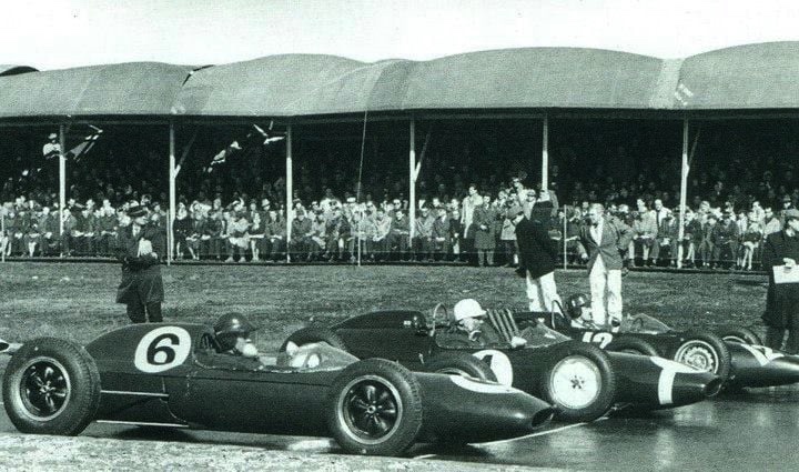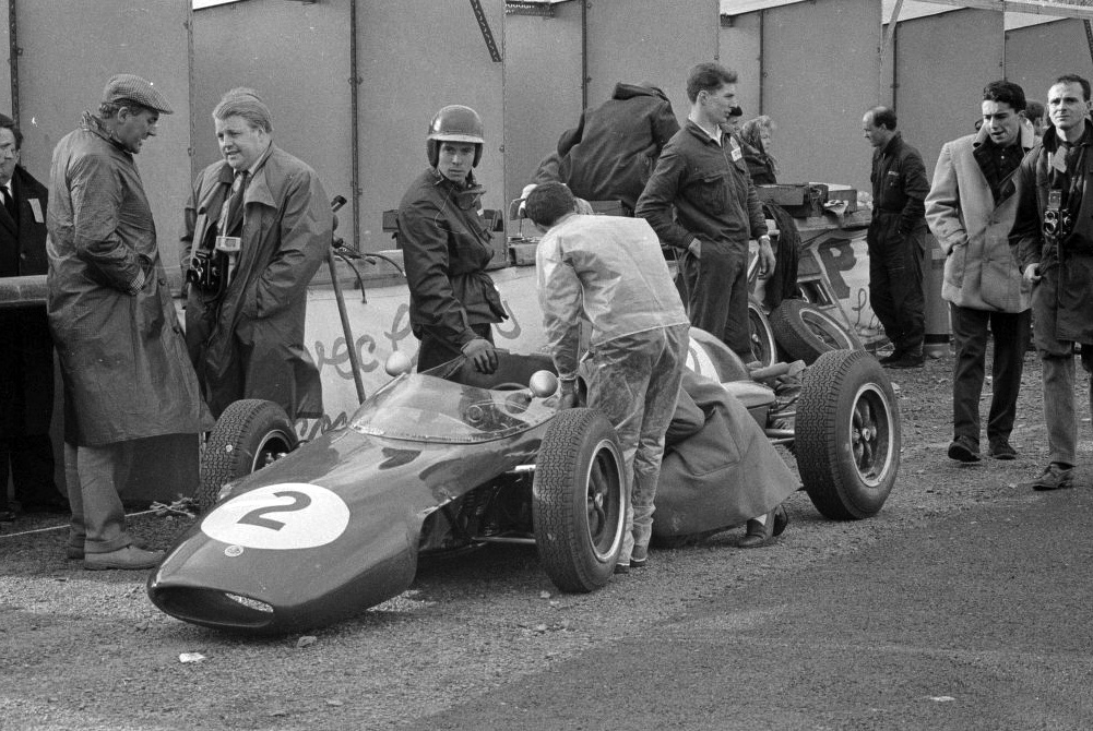 Grille de départ du GP de Grande Bretagne à Aintree aux côtés de John Surtees sur sa Lola Mk4 A et Innes Ireland sur la Lotus 24 du UDT Laystall Racing Team