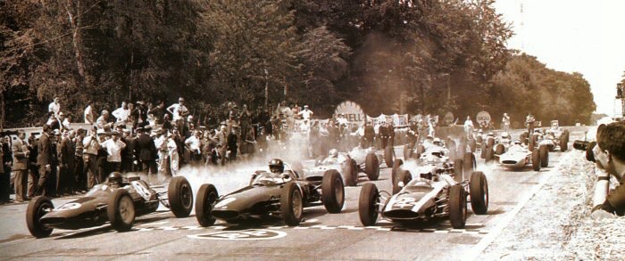 Départ GP de Monaco : Willy Mairesse et sa Ferrari s'inflilre en forçant un peu entre Jim et Graham Hill !