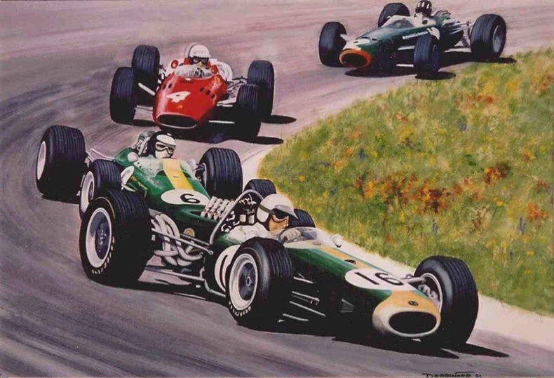 • GP des Pays Bas à Zandwoort 1966 : Jim à la poursuite de Jack Brabham devance Mikes Parkes et Graham Hill. Il terminera sur le podium à la troisième place derrière Brabham et Hill.