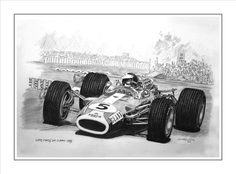 • Jim au volant de la Lotus 49 en 1967 (dessin aux crayons graphités !)