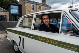 Dario Franchetti dans une Cortina Lotus devant le nouveau musée...
