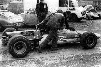 Hockenheim, le 6 avril 1968, durant la séance d’essais. De gauche à droite: Kurt Ahrens, Jim Clark et Dave Sims. (source: http://www.carlosghys.be/).