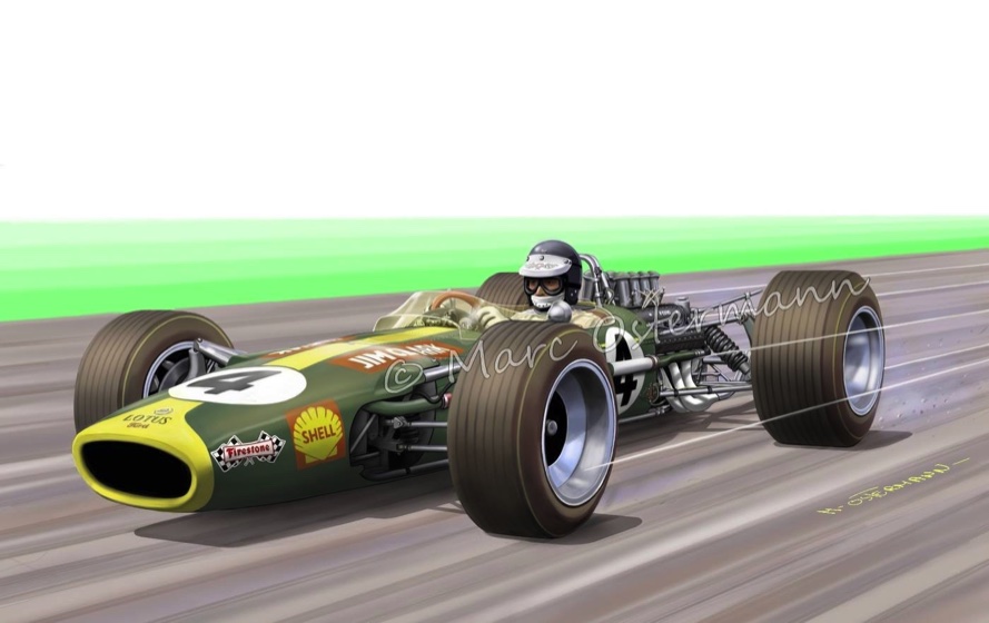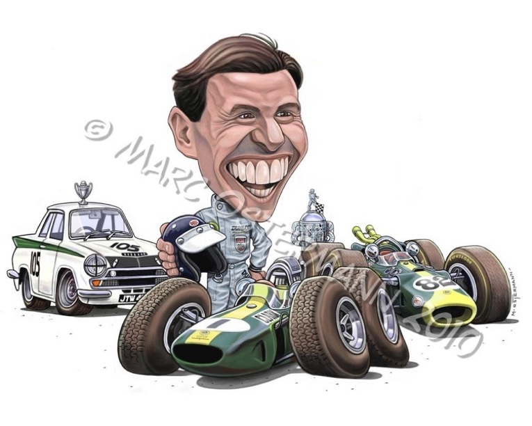 • La caricature de Jim Clark sur ... la Lotus N°. 20 du GP d’Italie à Monza en 1967