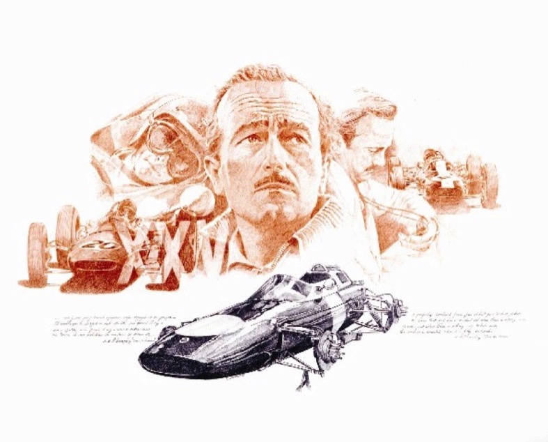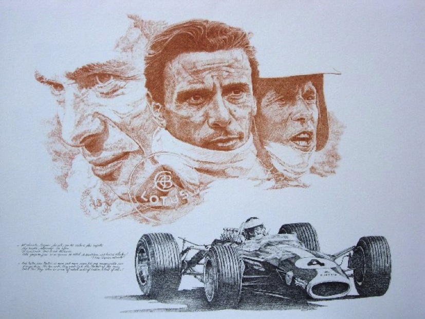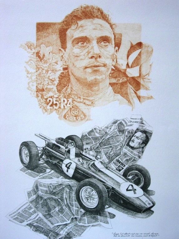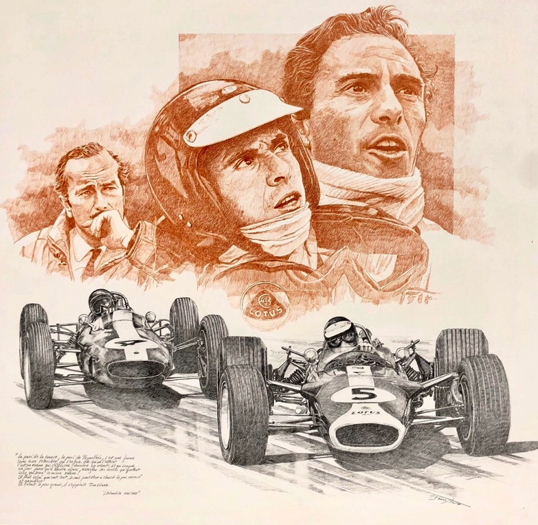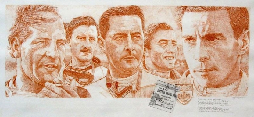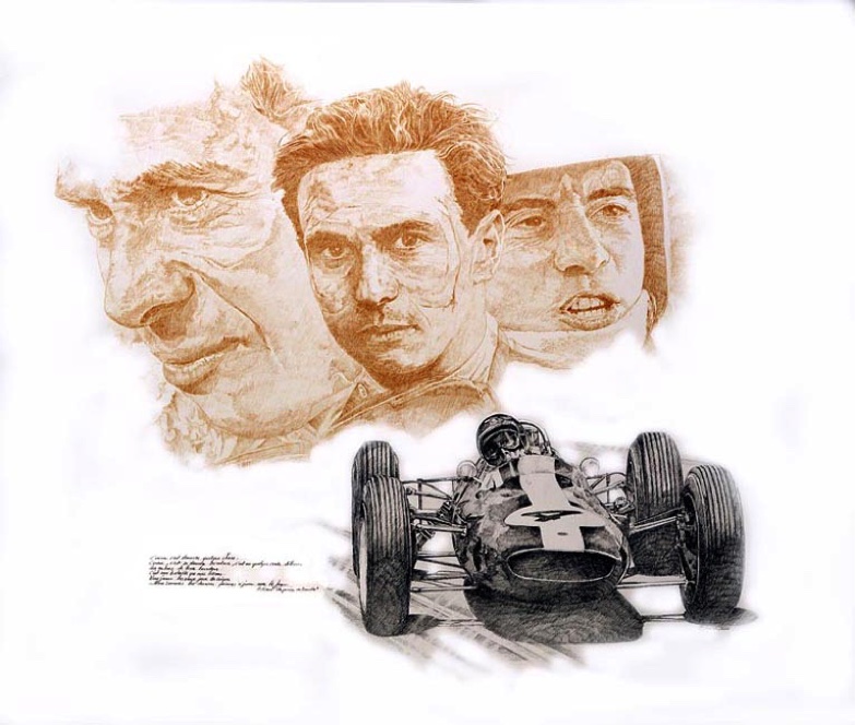*Patrick Brunet a ajouté un nouveau dessin exceptionnel, en 2011, avec un très beau texte d’Alfred Tennyson parfaitement choisi et en phase avec les visages des imminents membres du BRDC : Innes Ireland, Graham Hill, Jack Brabham, Jackie Stewart et ...Jim Clark