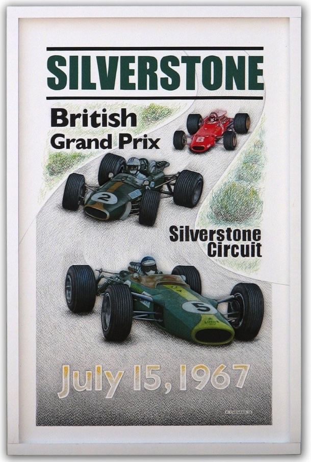 ✴ La «fausse» affiche du GP de Grande Bretagne 1967 à Silverstone avec Jim Clark devant Denis Hulme et Chris Amon : les
