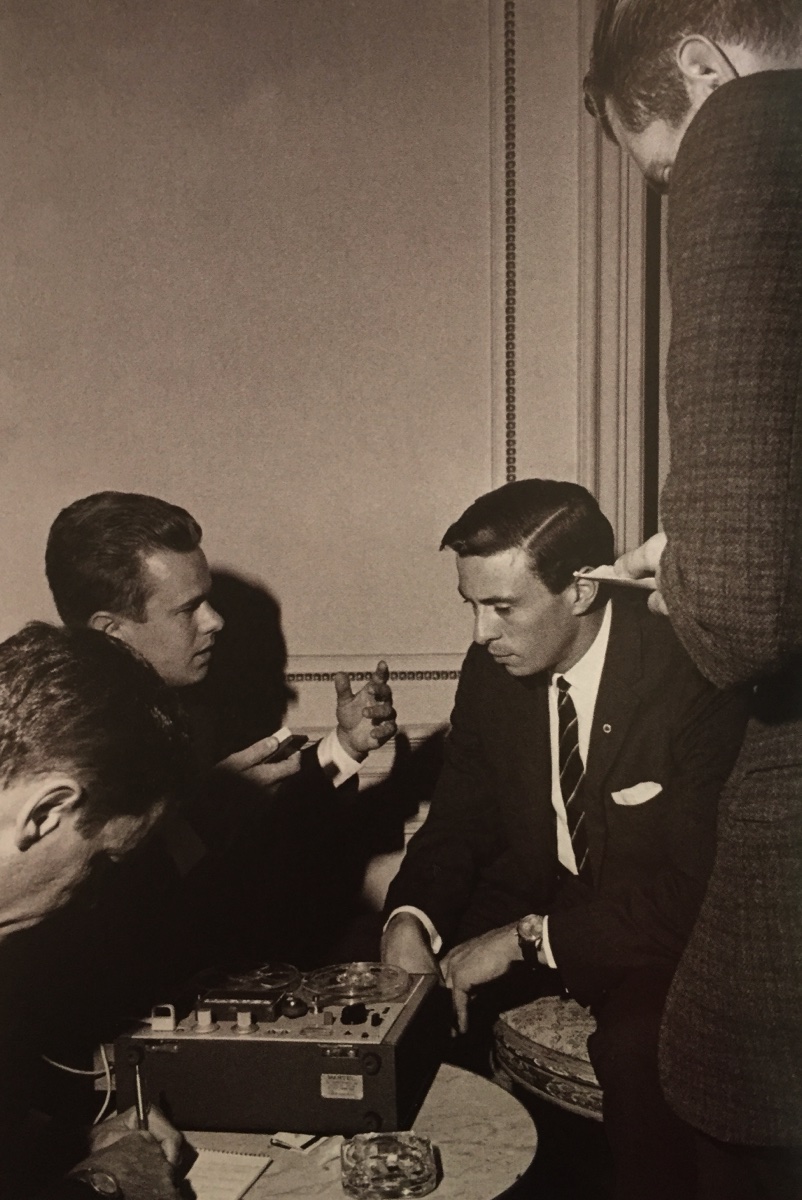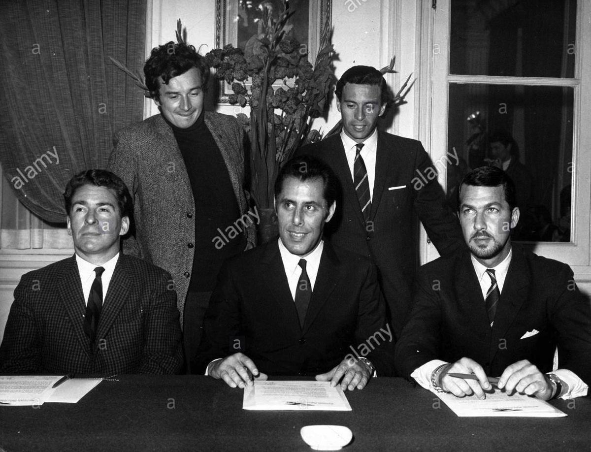 1967; Paris, au siège de la F.I.S.A., Dr. Andrew Ferguson, Jo Bonnier, Jean Pierre Beltoise et Jim Clark.