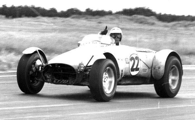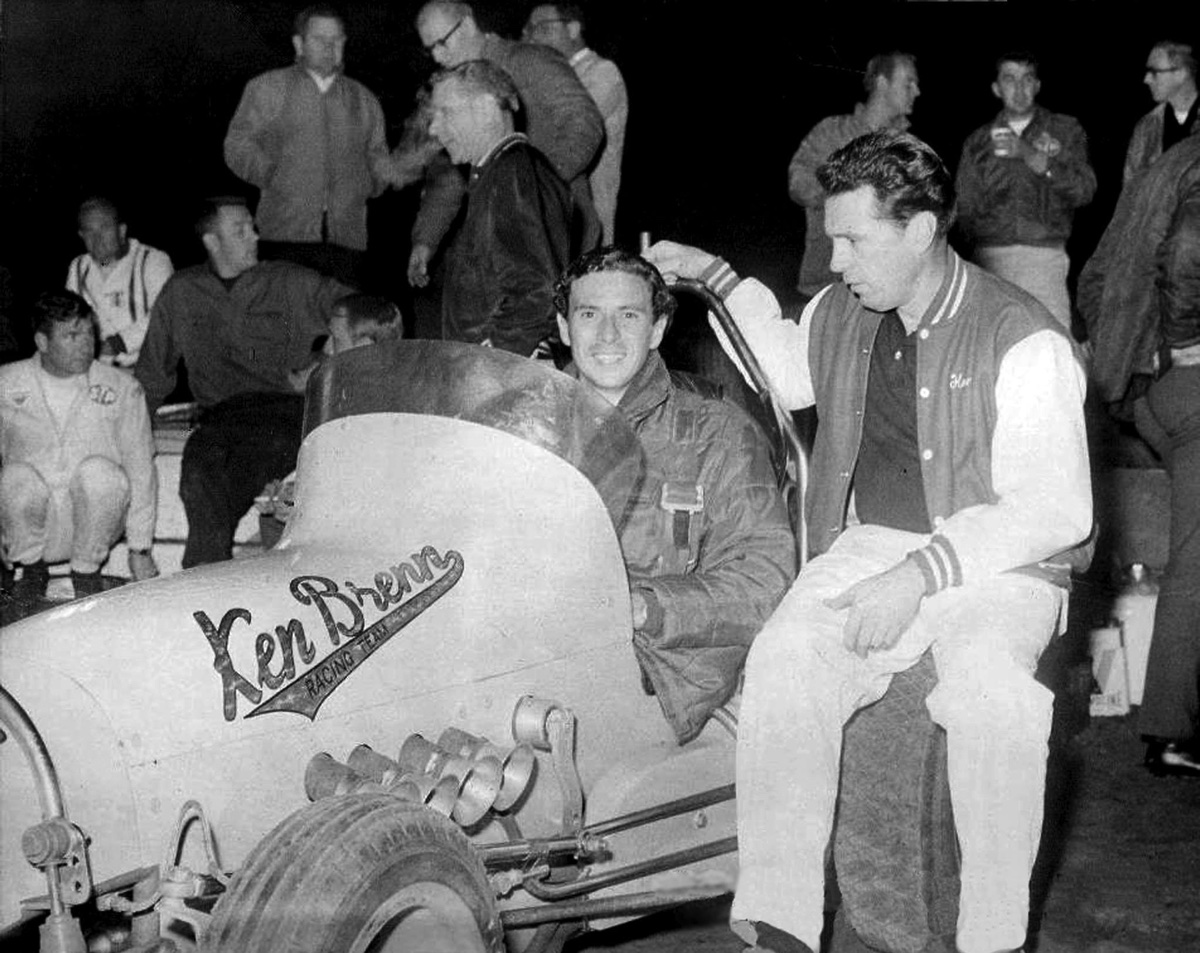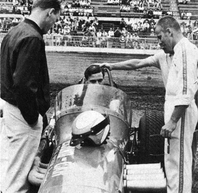 Jim pose dans le cockpit de la midget de Boby Marshman à Springfield sous l'oeil amusé de Dan Gurney