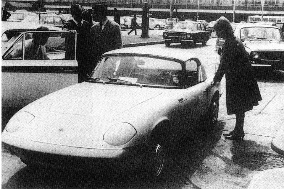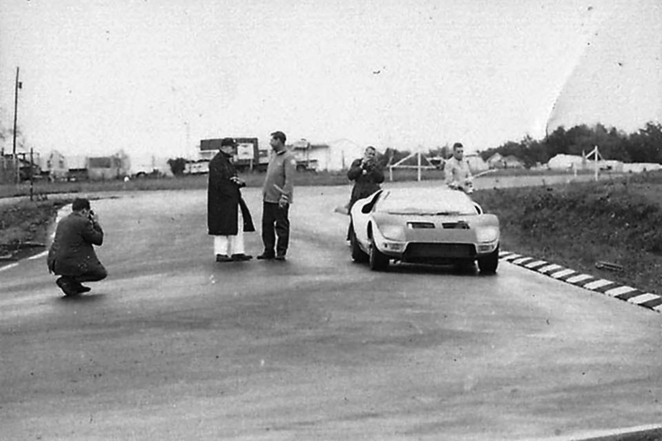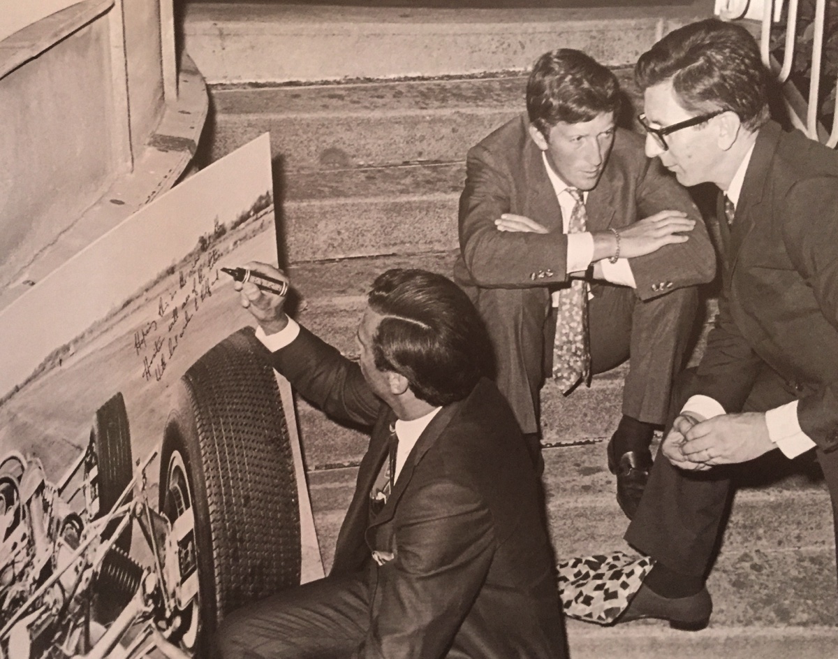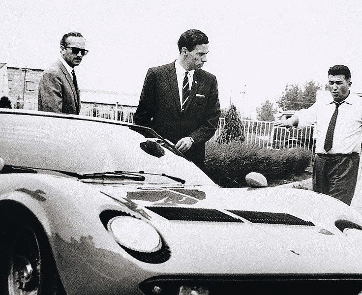 Présentation de la Lamborghini Miura en 1967 à Jim Clartk et Colin Chapman avec les ingénieux Stanzani et Dallara et du patron Feruccio Lamborghini