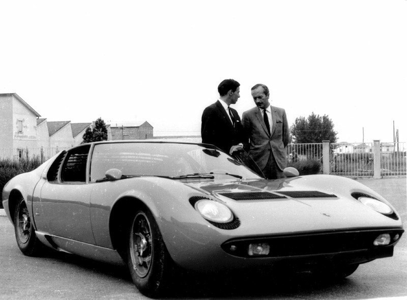 Colin Chapman, Jim Clark et Ferrucio Lamborghini devant la Miura
