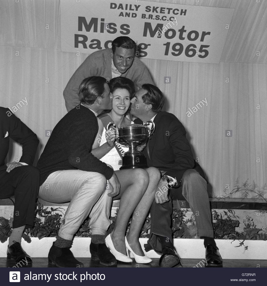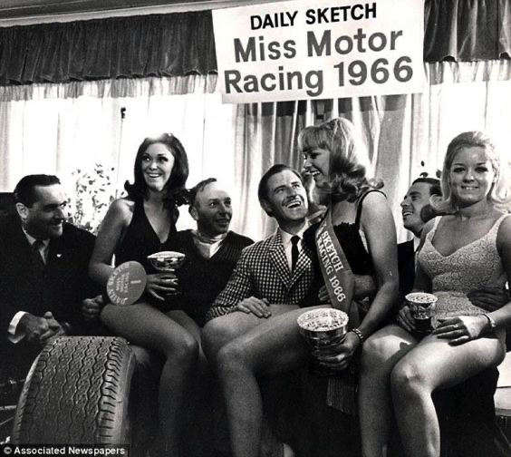 Graham Hill, Jim Clrk, et Jack Brabham font un câlin à Jackie Peterson : MIss Motor Racing 1965...
