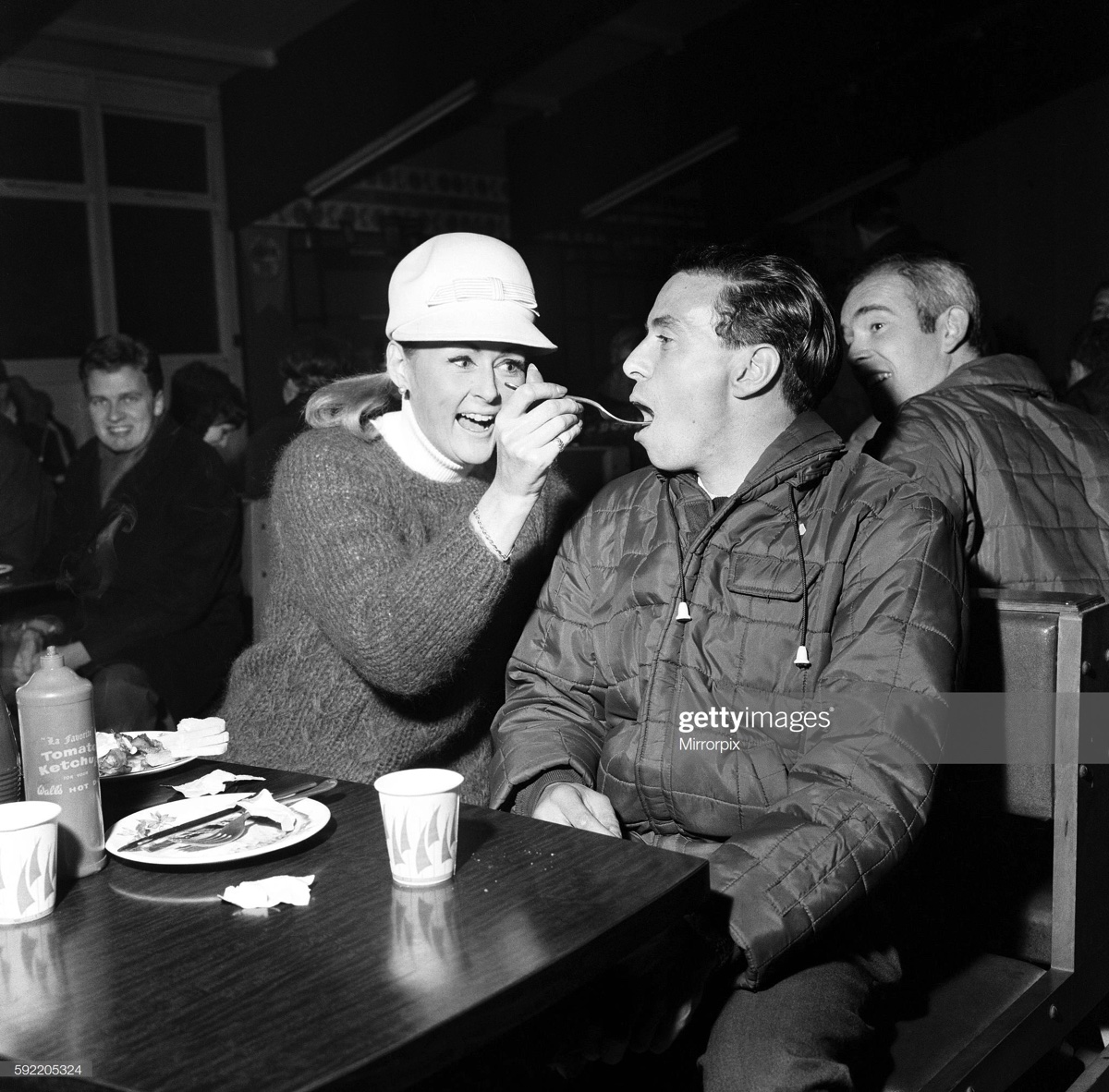 Jim se fait nourrir par Rosemary Smith; femme pilote itrlandaise lors du RAC 1966...