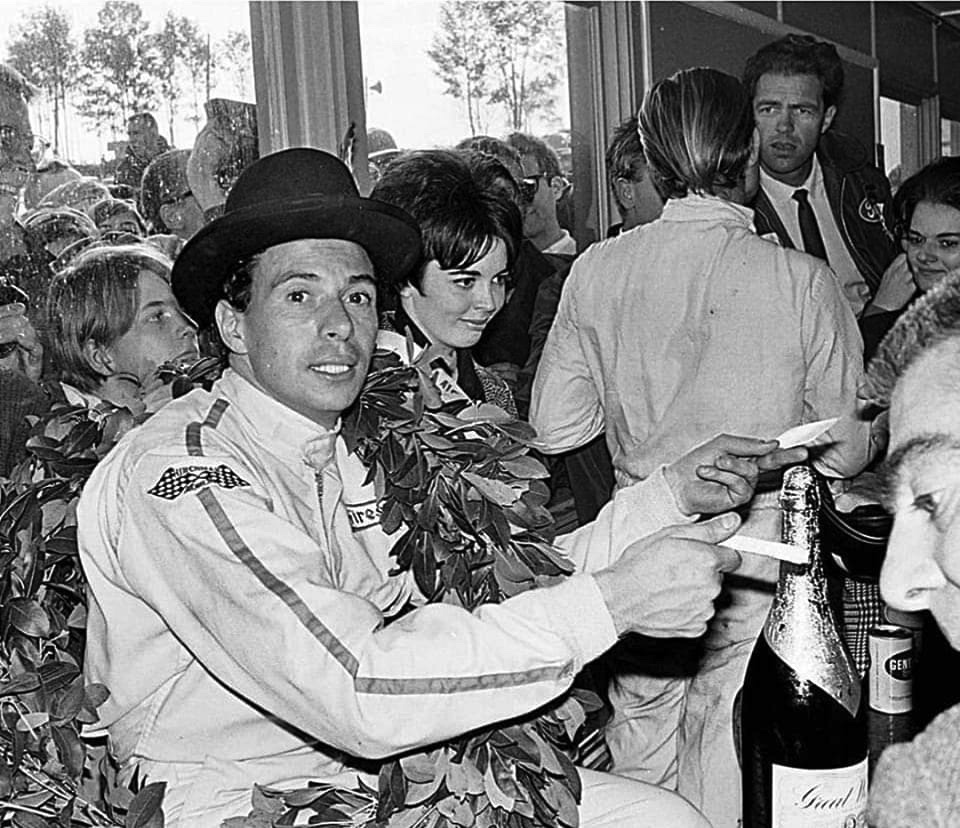 Après l'arrivée du GP des Etats Unis 1967 (De dos, son coéquipier Graham Hill)