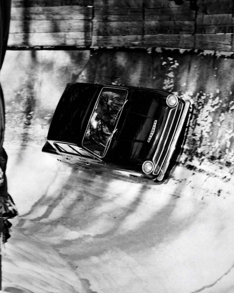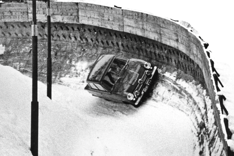 jJim Clark tourne sur une Cortina sur une piste de bobsleigh à Cortina d'Ampezzo