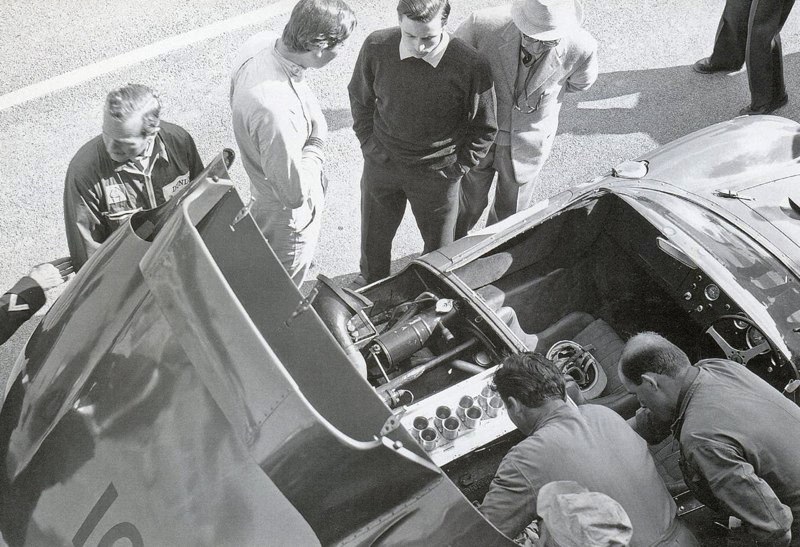 Jim Clark et Colin Chapman inspecte une Ferrari