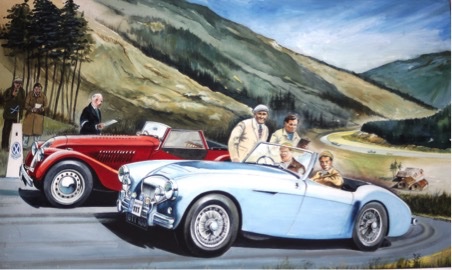 Peinture de Bill Anderson de Jim avec Billy Potts sur l'Austin 100, derrière la Morgan +4 de Franck Dundas et d'un certain Erick Dymock qui écrira un tres beau livre sur Jim Clark...