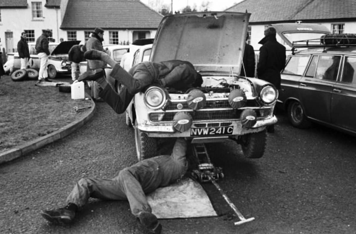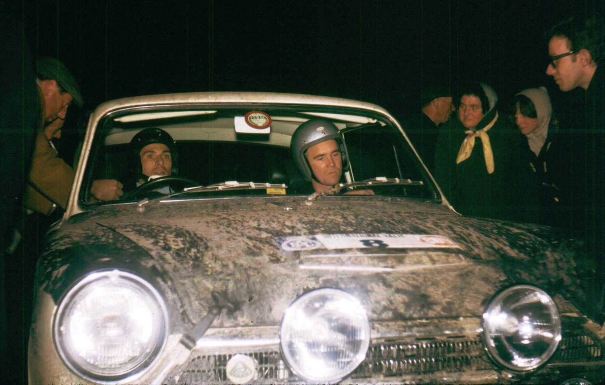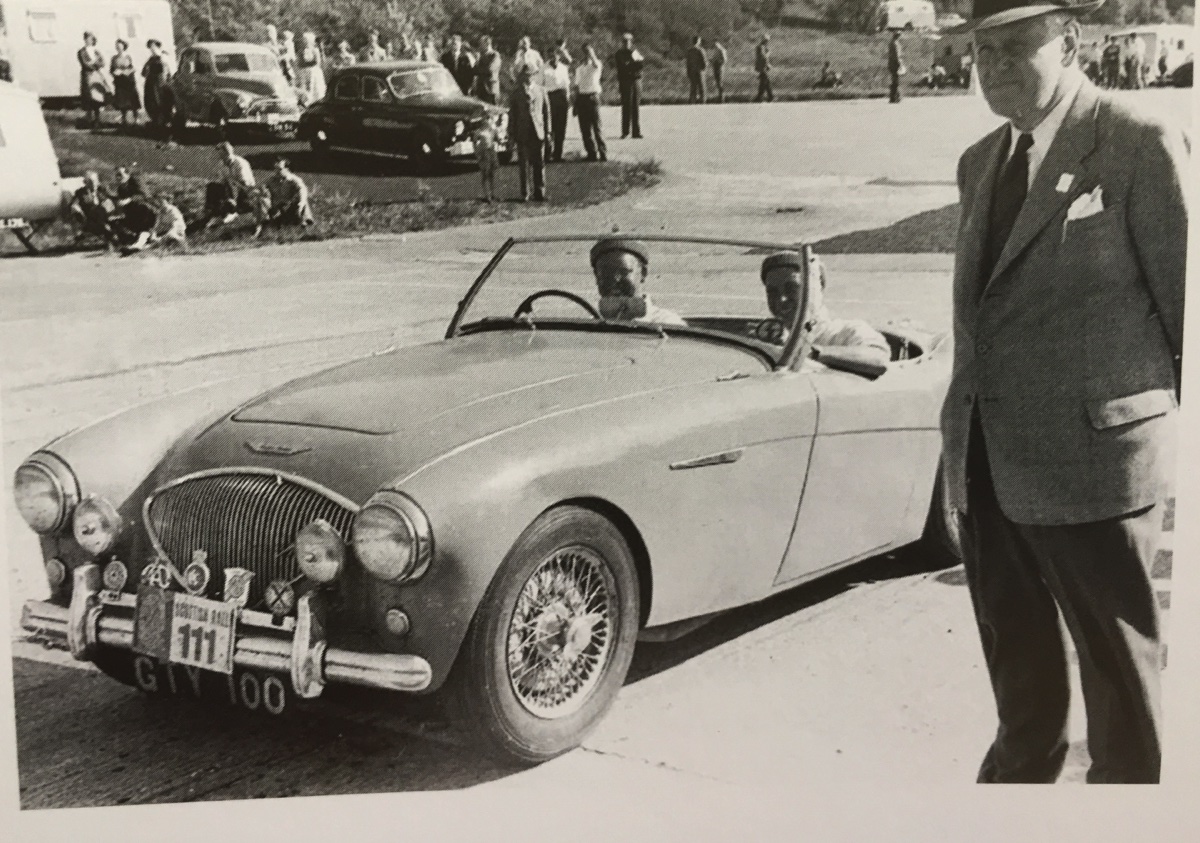 Billy Potts au volant de l'Austin 100 à côté de lui, son cousin et copilote Jim Clark dont c'est la première compétition !