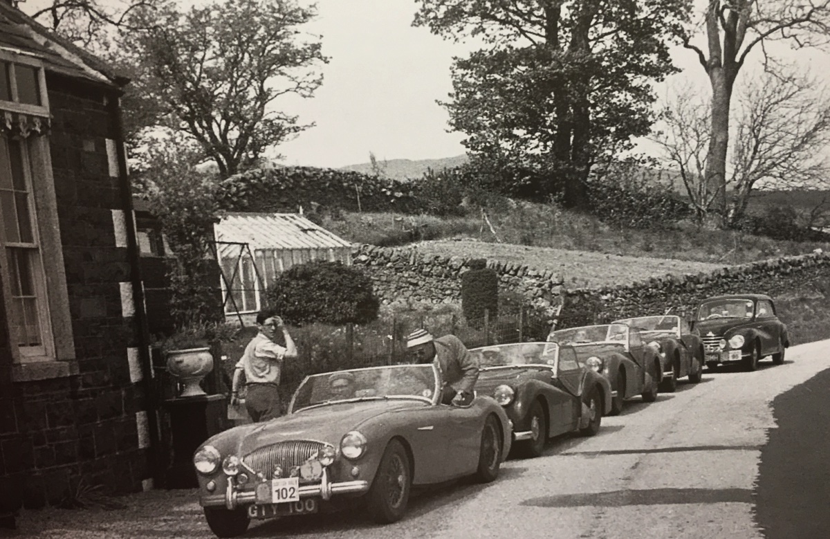 Scottish Rallye, derrière l'Austin, des triumph et la DKW de Ian Scott Watson (à gauche avec les lunettes)