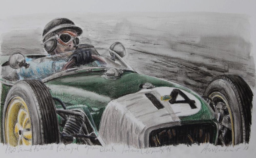 * Jim Clark vers son 1er podium au Grand Prix du Portugal 1960 après avoir taper aux essais (Crayon aquarelle sur Canson)