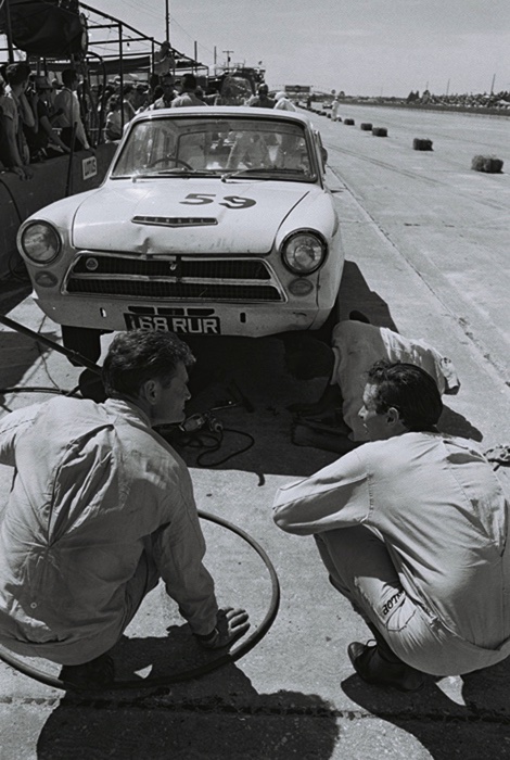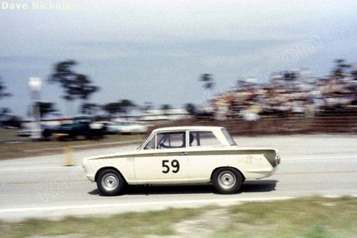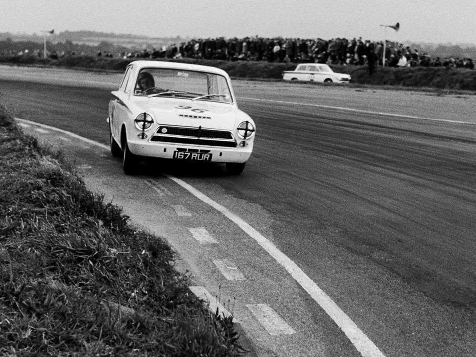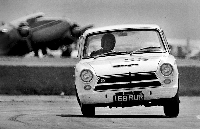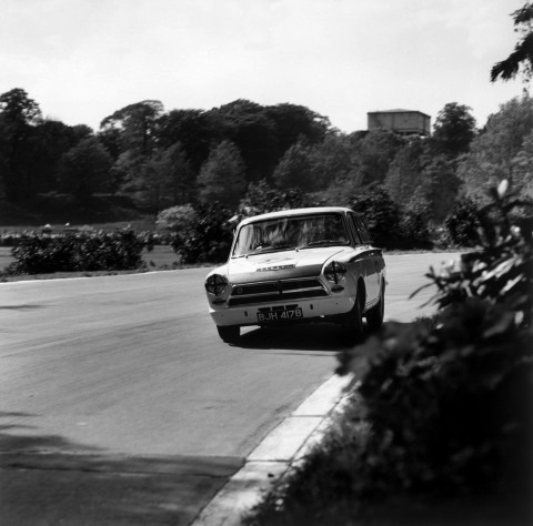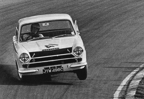 Jim et la Lotus Cortina avec la roue avant gauche en l'air... Goodwood Meeting Easter Monday 1964