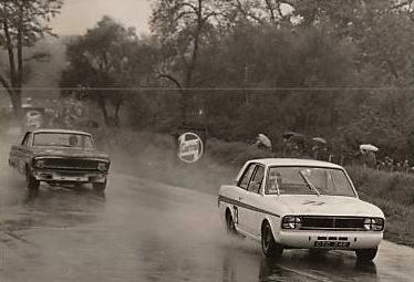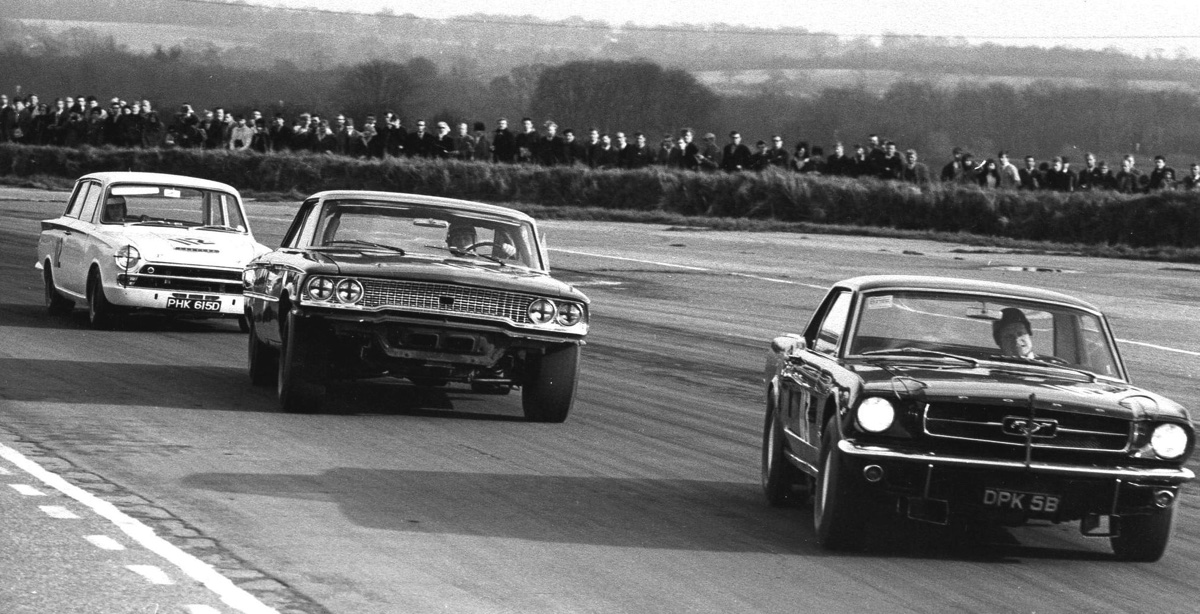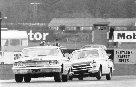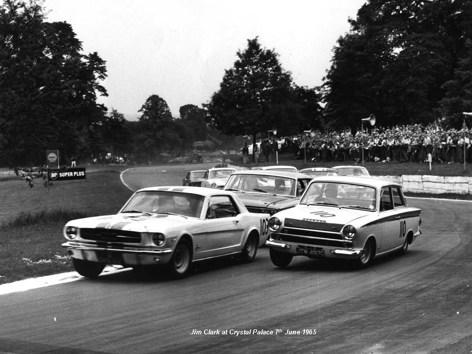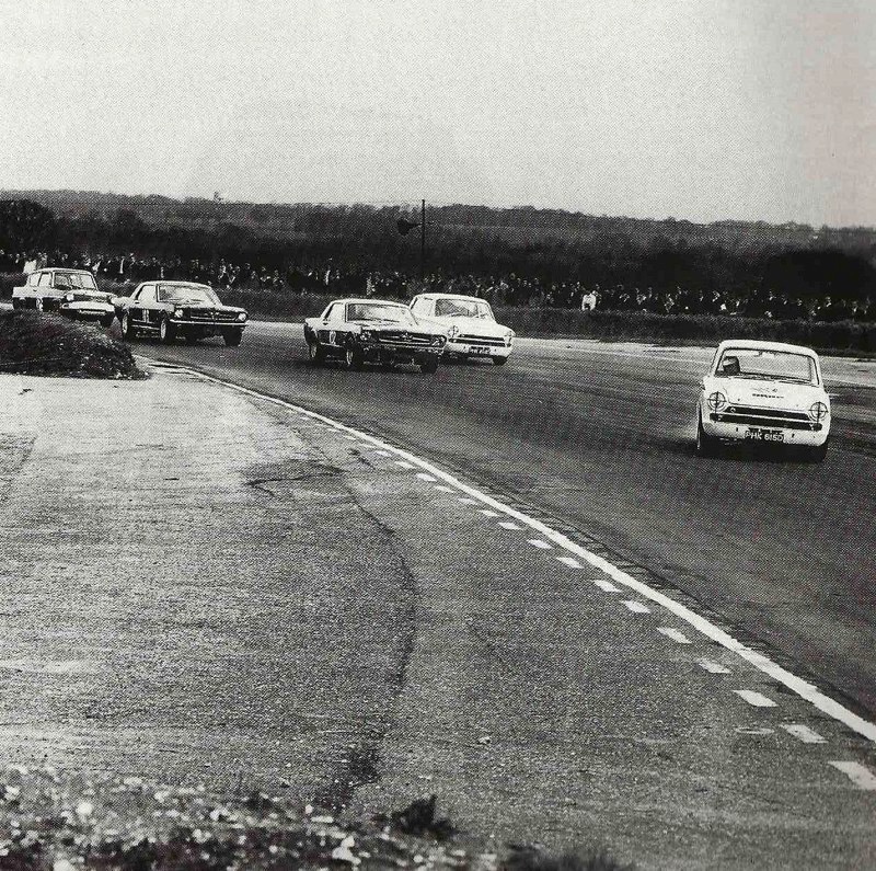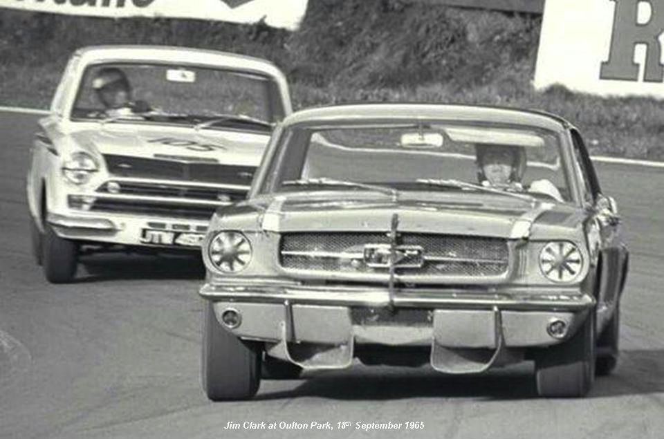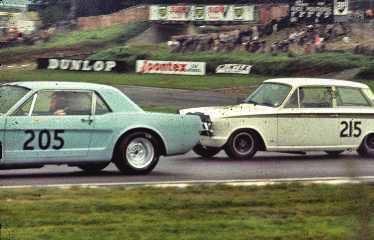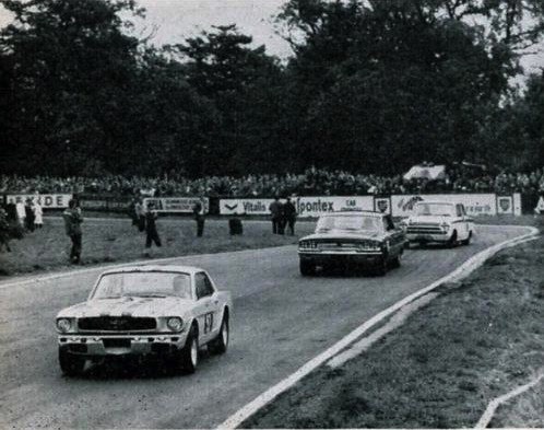 Jackie Oliver Mustang devant Brian Muir Ford Galaxie et Jim Clark Cortina en 1966