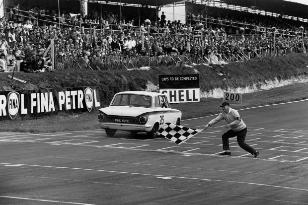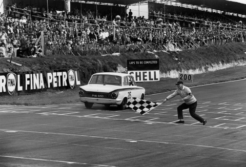 1966 Brands Hatch, Jim Clark, Lotus Cortina, passe le drapeau à damiers