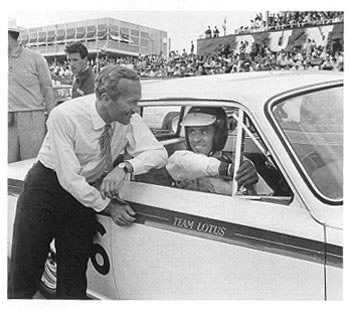Jim avec un copilote inhabituel : Colin Chapman, rient sur la ligne d'arrivée !