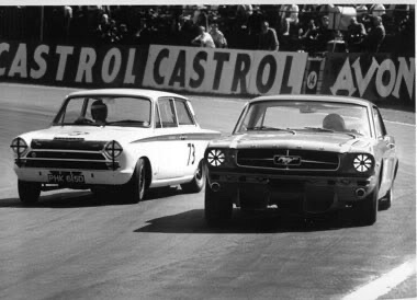 Jim poursuivi par Jack Brabham sur une Ford Mustang au St Mary'S Trophy, à Goodwood 1965