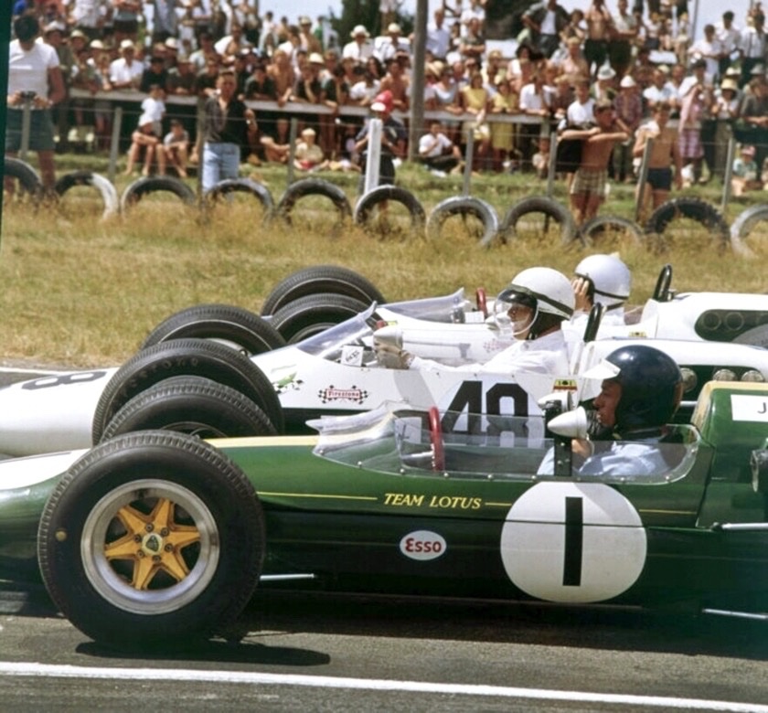 Jim sur la Lotus 32B en bagarre avec Franck Maticjh , parti en première ligna sur une Brabham BT 7 à Longford