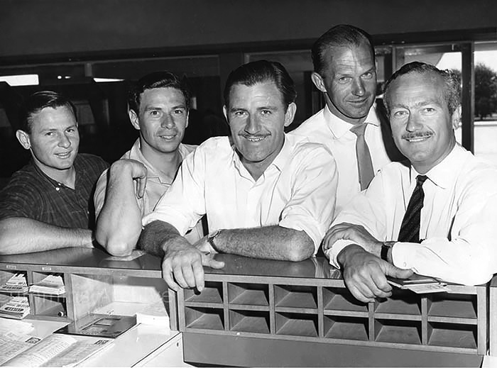 Bruce McLaren, Jim Clark, Graham Hill, Franck Gardner et Colin Chapman se retrouvent aux antipodes après les grand prix sur le vieux continent